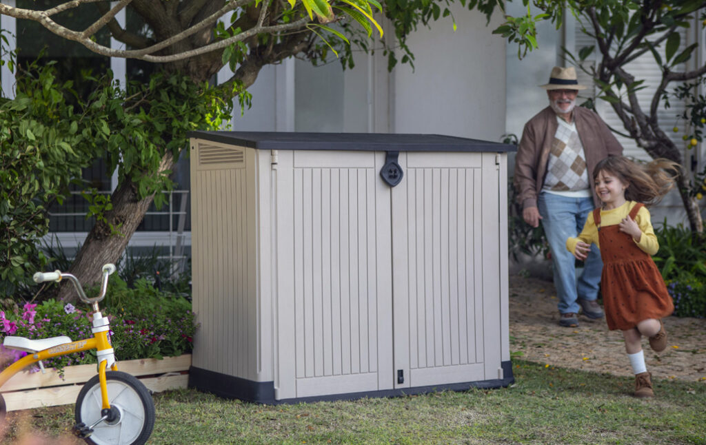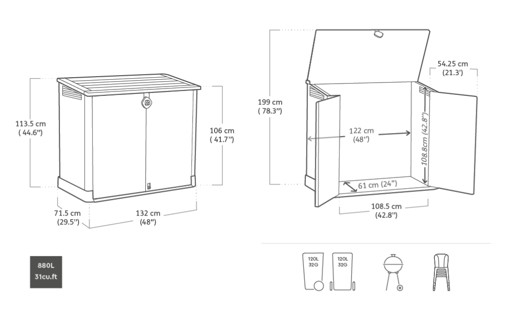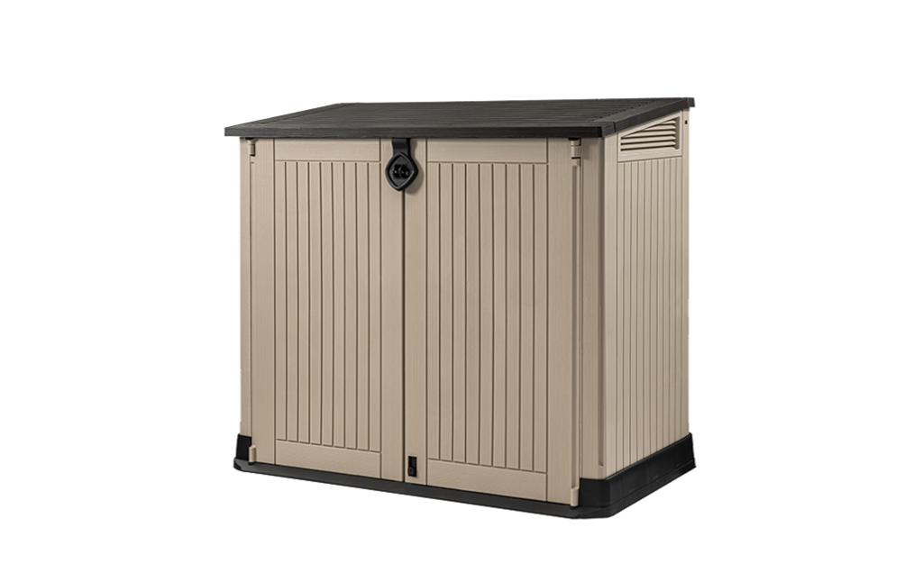 Ideal para espacios interiores y exteriores, proporciona almacenamiento bien ventilado de hasta 845 L de artículos. Fácil transporte en coche gracias a su embalaje optimizado. Adecuado para espacios al aire libre en el hogar y muy cómodo y rápido de montar. Incluye suelo, puertas frontales y parte superior. Fabricado con resina resistente, duradera y resistente a cualquier clima.